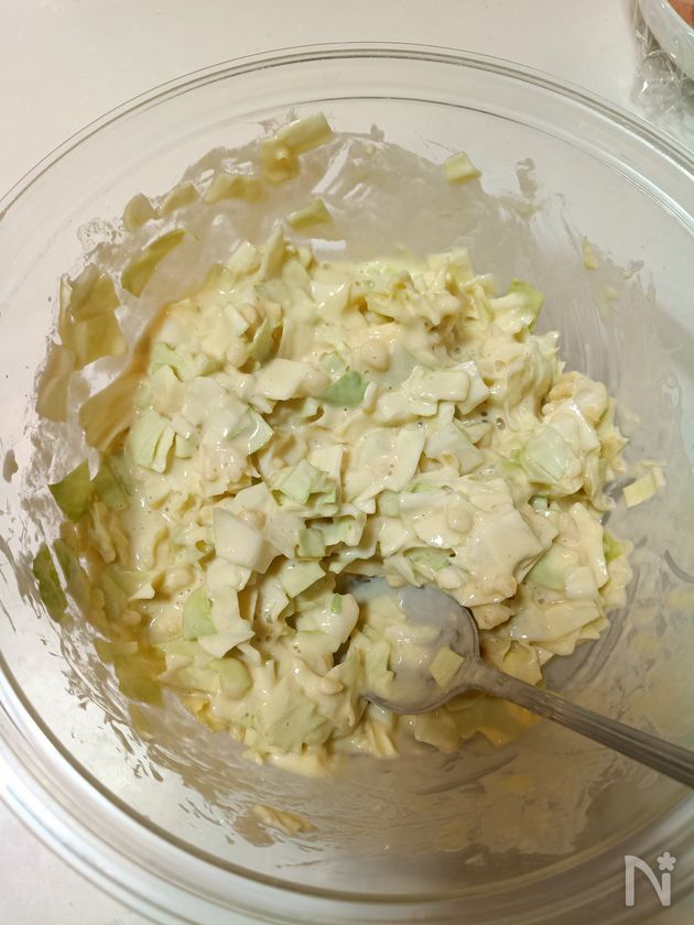 (4) 3のボールに卵、天かすを加え、底からすくうように混ぜ合わせる。(混ぜすぎないようにする)