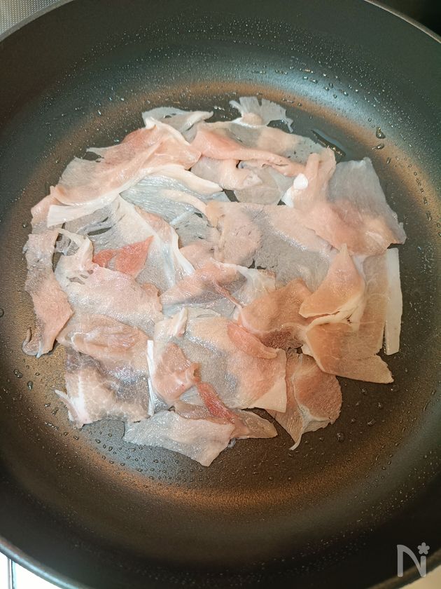 (5) 油小さじ1をフライパンに入れ、キッチンペーパーで全体に伸ばす。豚コマ肉を敷き、中火にかける。