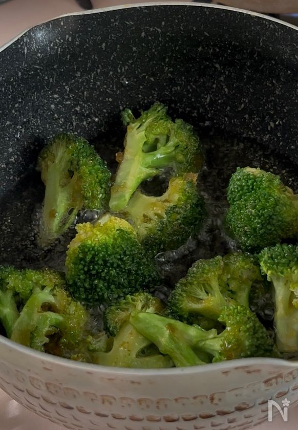 (3) 鍋に油を入れて、温まったらブロッコリーを加える。2分間揚げる。