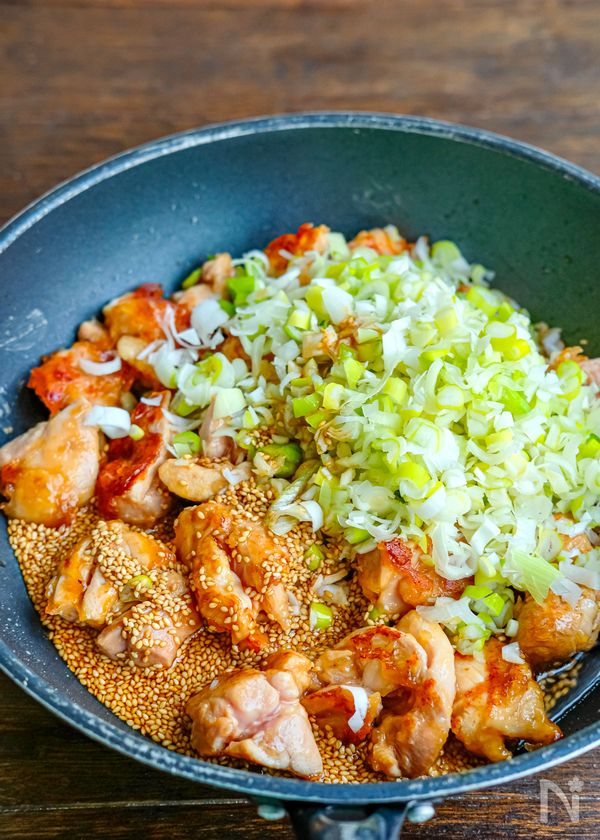 (5) 両面こんがり焼けたら長ねぎと(B)を加えて炒め合わせる。