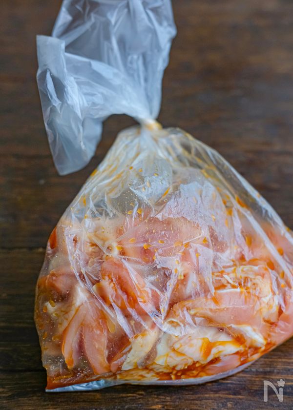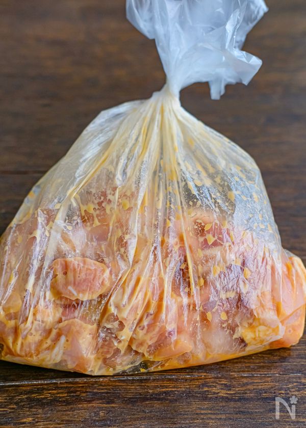 (1) ポリ袋にひと口大に切った鶏もも肉と【A】を入れて揉み込む。