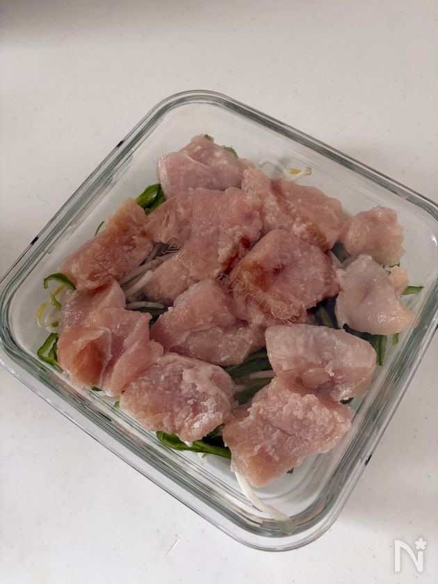 (3) 耐熱容器に野菜を敷き、上に鶏肉を重ならないように並べる。ラップまたはふたをして、600Wの電子レンジで2分加熱する。