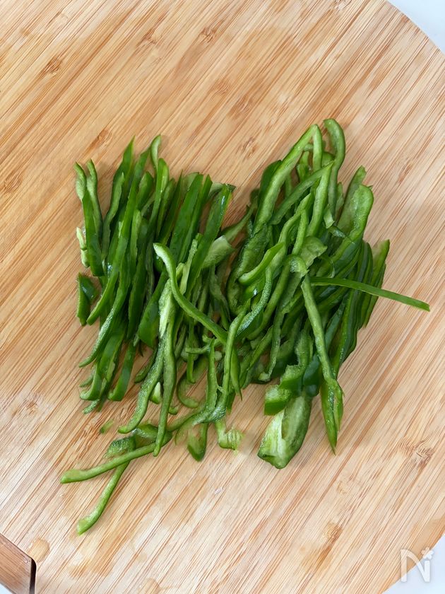 (2) ピーマンは細切りにする。