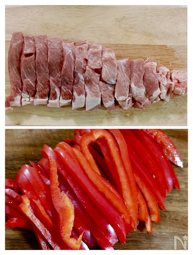 (下準備) 赤パプリカは細切り、豚肩ロースブロック肉は1cm幅に切る。