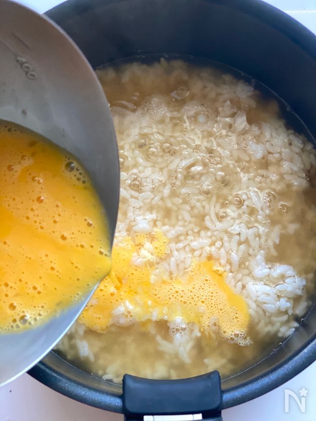 (2) すぐにふつふつしてくるので、卵を少し上から円を描くように流し入れ、弱火におとしそのままの状態で加熱する。