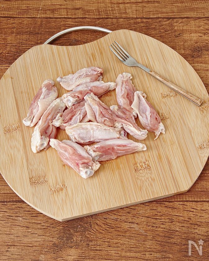 (1) 手羽中(ハーフ)フォークで全体に穴をあける。