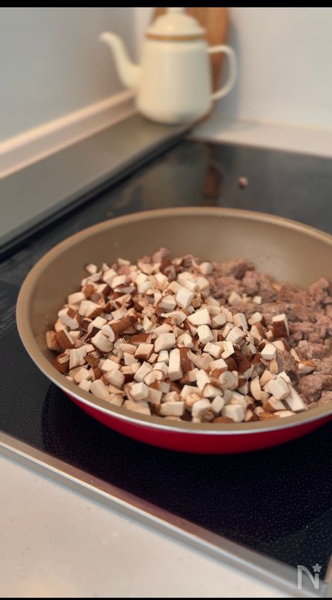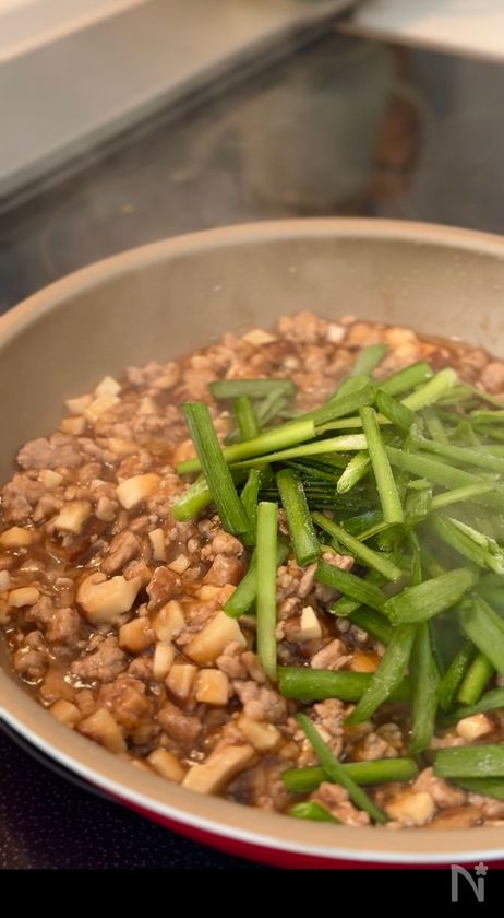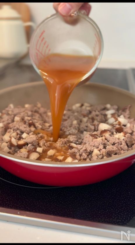 (4) 豚ひき肉に火が通ったら、①のしいたけを加えて炒める。