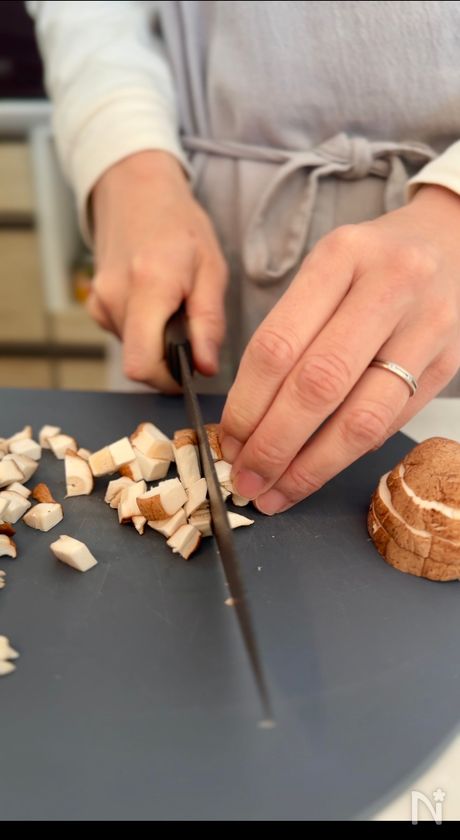 (1) しいたけは、軸を取って1cmの角切りに切る。軸もみじん切りにしておく。