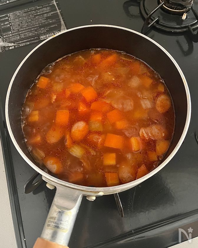 (3) 【A】を加え、煮立ったら弱火にし、野菜が柔らかくなるまで10分ほど煮込む。