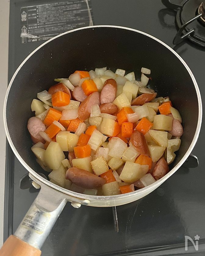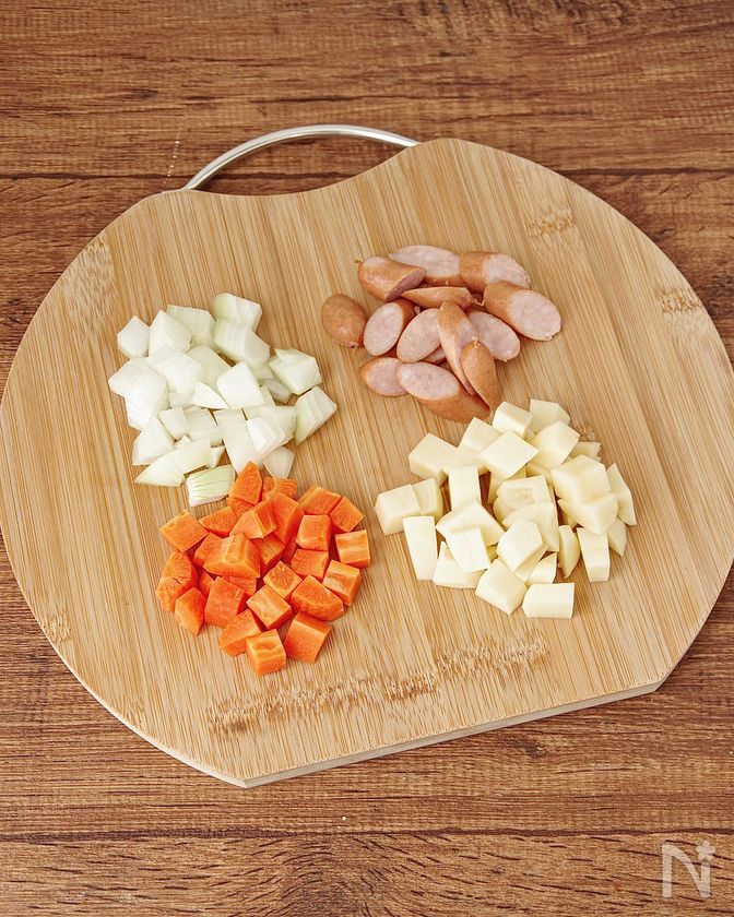 (1) じゃがいも、玉ねぎ、にんじんは1cm角に切る。ウインナーは斜めに5等分に切る。