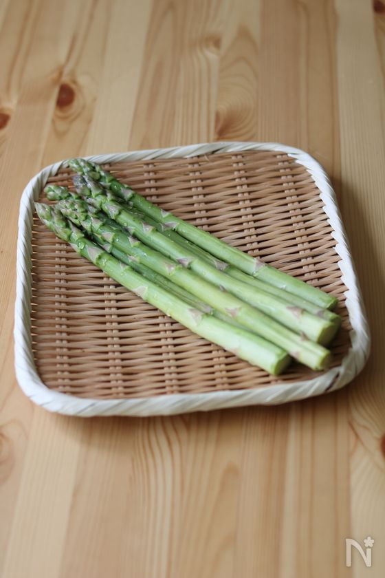 (1) アスパラは、根元の固い部分をピーラーなどで剥き、3等分にきる。