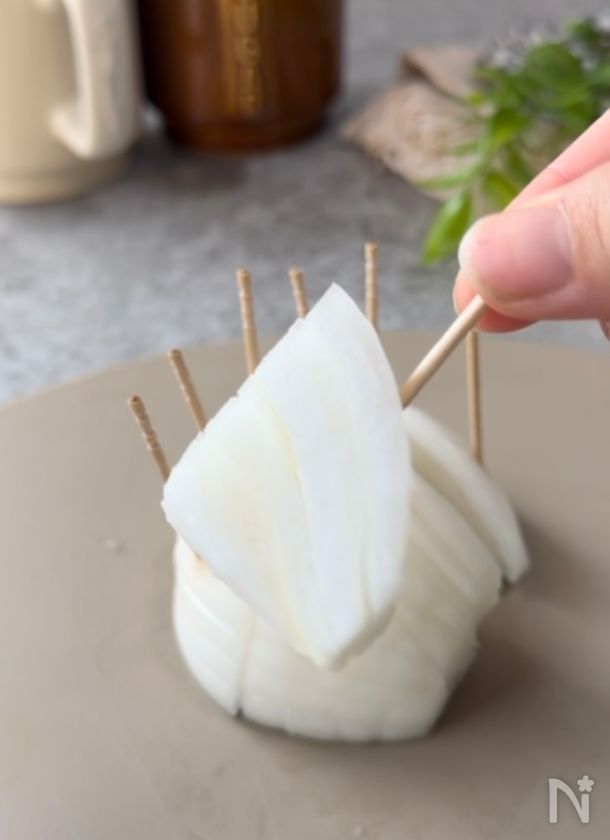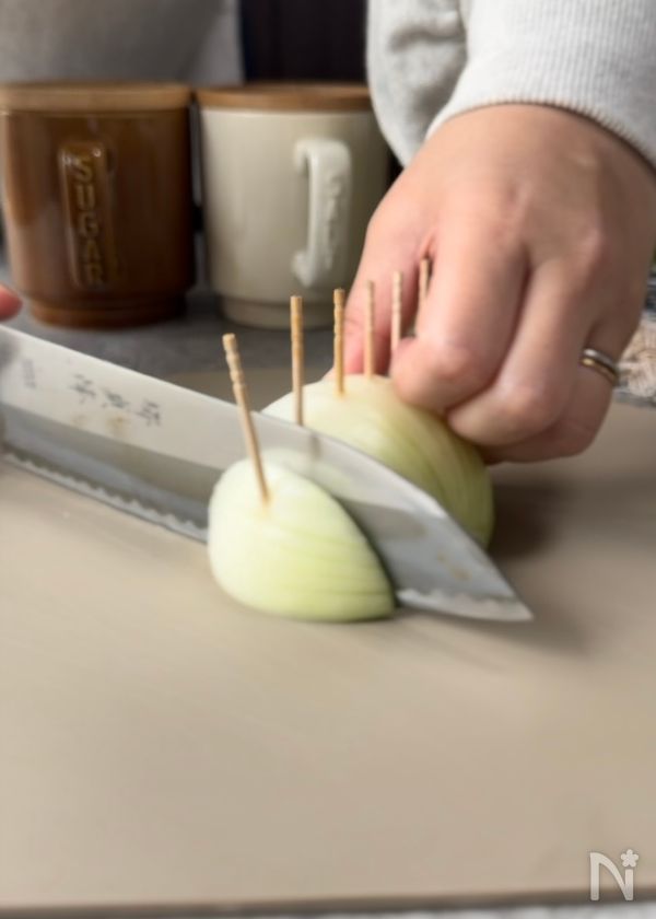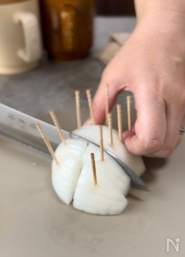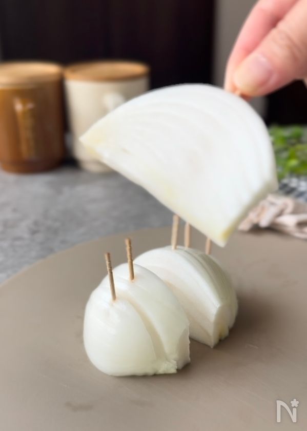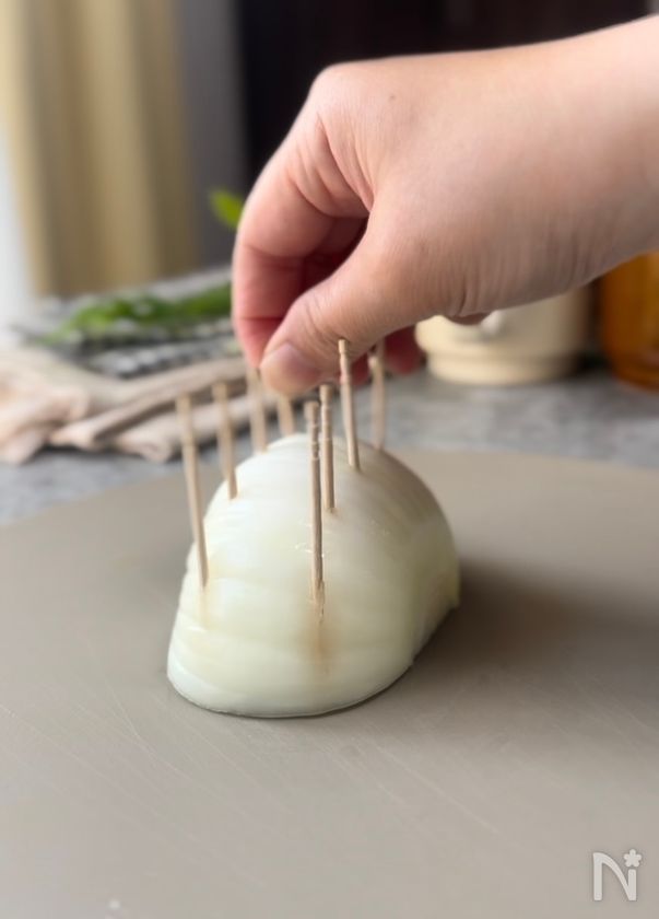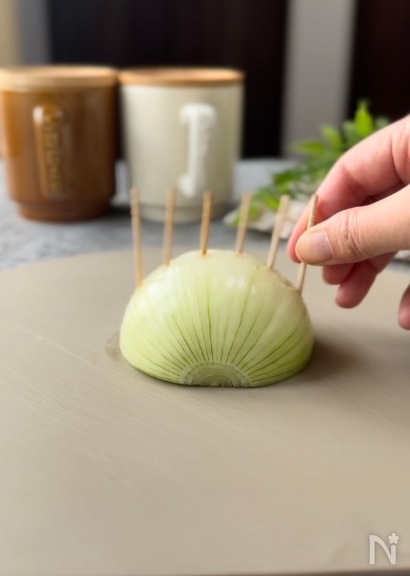 (1) 玉ねぎの皮をむいて半分に切って、等間隔につまようじを刺していく。(向きは画像みてね)