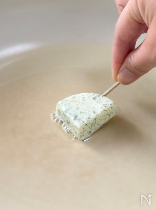 (2) つまようじが刺さっている間を等間隔に切っていく。