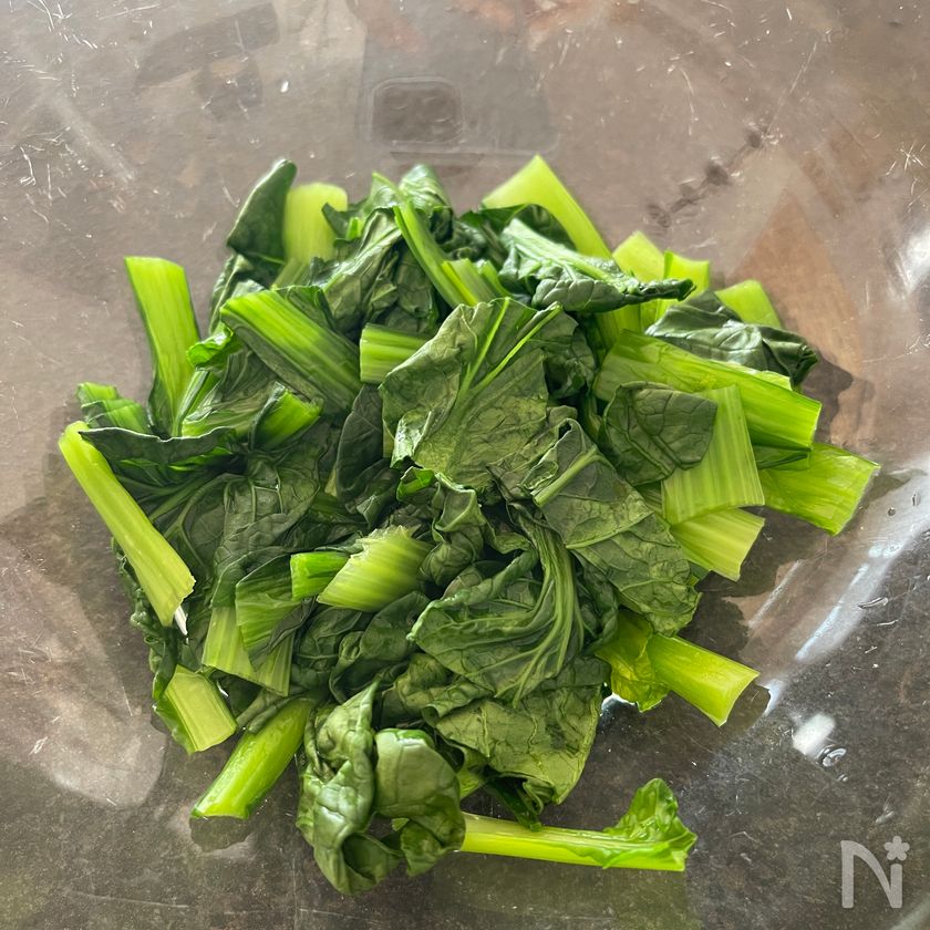 (1) 小松菜は3cm幅に切り、レンジ600wで2分半加熱する。出てきた水分は絞る。