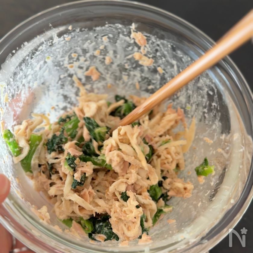 (2) 水切りしたツナ缶と切り干し大根、小松菜を【A】で和える。