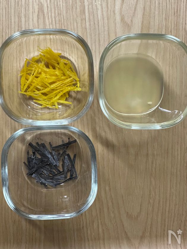 (2) ゆずの皮は薄くむき、千切りにする。半分に切り、種を漉しながら果汁を絞る。昆布はハサミで細く切る。
