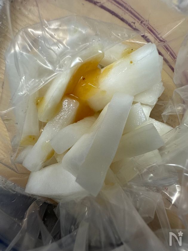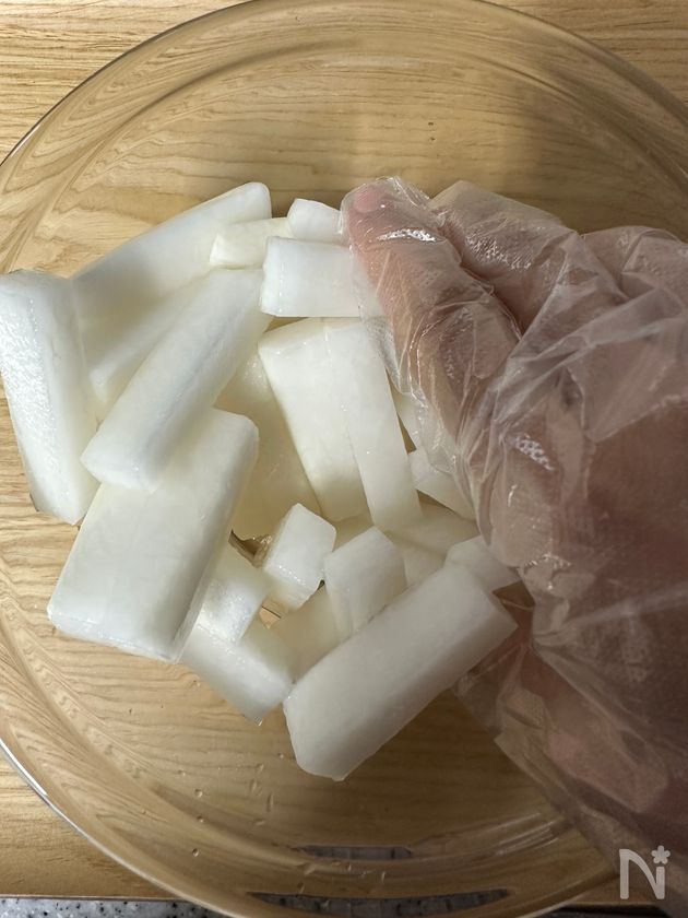 (1) 大根は皮をむき、1cm幅×5〜6cm長さの拍子切りにしたらボウルに入れる。塩をもみこみ、10分ほどおく。大根がしんなりしたら取り出し水気を絞る。