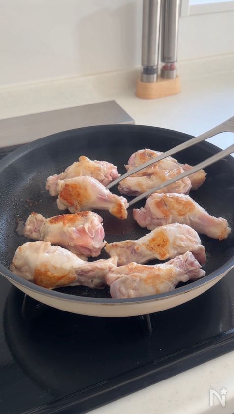 (2) フライパンにごま油を中火で熱し、手羽元を全面焼き目がつくまで焼く。