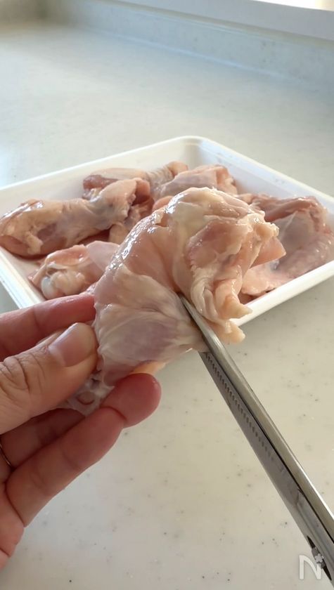 (1) 手羽元は骨に沿ってハサミで2か所程切り込みを入れる。