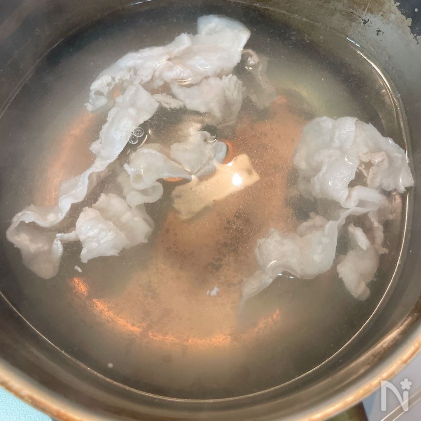 (1) 小鍋に水を入れて沸騰させたら【A】を入れて弱火にし、豚バラ肉しゃぶしゃぶ用を数枚ずつ色が変わるまで茹でる。