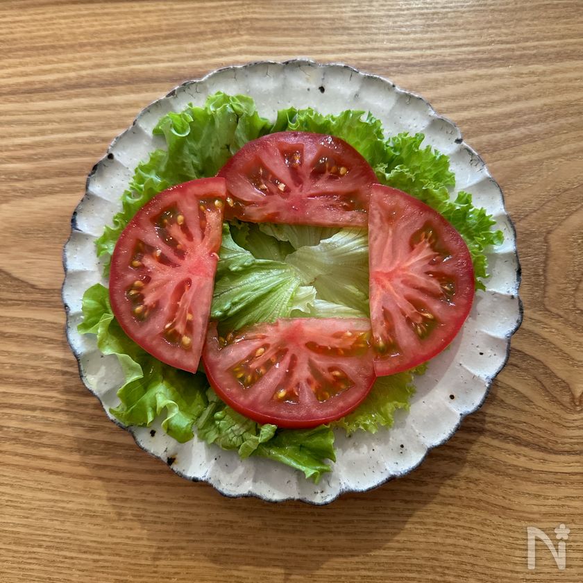 (5) 器にレタス→トマトを並べる。