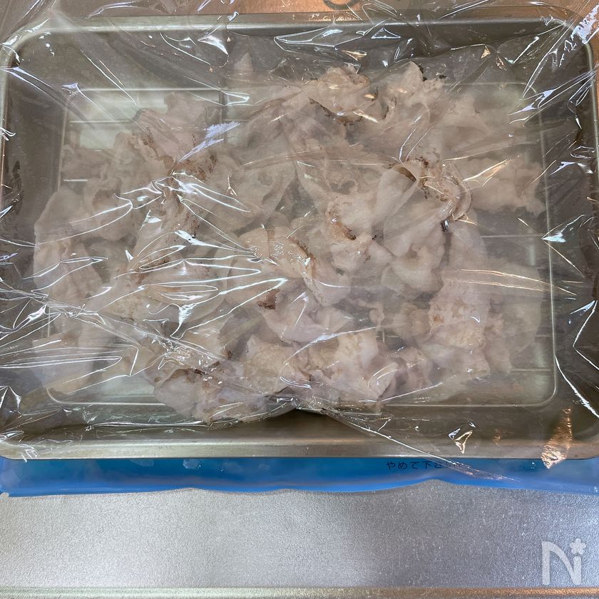 ・豚肉は茹でたあと時短のためにバットの下に保冷剤をしいてます。乾燥防止のために必ずラップをしてください。