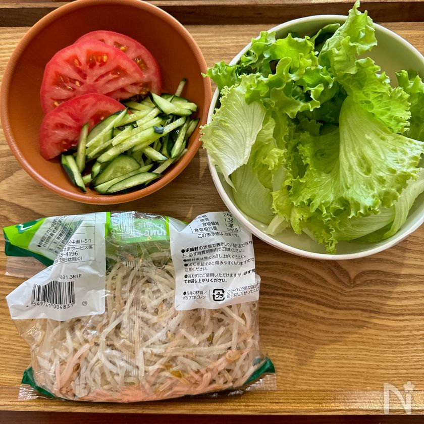 (4) レタスはちぎり、トマトは5mm幅に切る。きゅうりは細切りにする。もやしはレンジ600wで3分加熱後、水気を絞る。