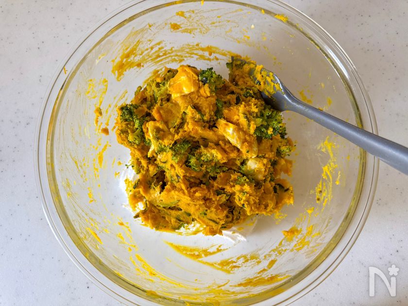 1.5cm幅程度のくし切りにしたカマンベールチーズと、1のブロッコリーを2に加えてさっと混ぜる。