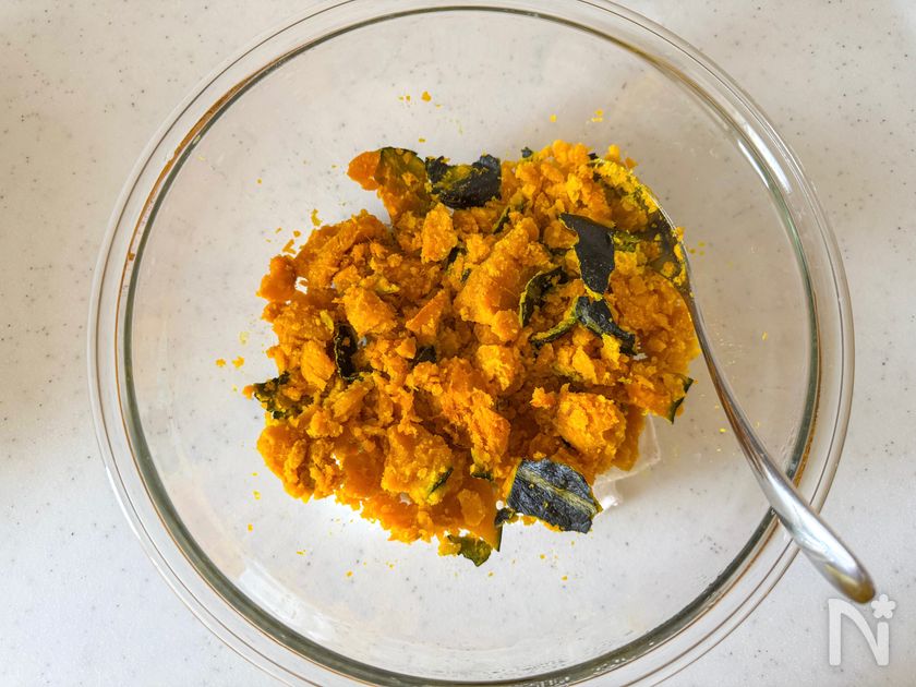 *かぼちゃの皮の汚れた部分などは削ぎ取ってから加熱してください。また、加熱は竹串がつかえることなく、スーっと底まで刺さるやわらかさになるまでレンジにかけてください。