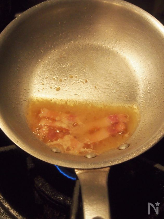 (2) にんにくの香りが出てきたらベーコンを入れしっかり炒めたら茹で汁を加え軽く煮詰め本だし、醤油、こしょうで味を整える。【90レードル2杯程度】