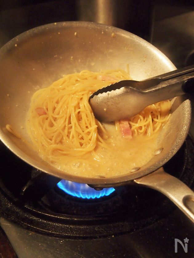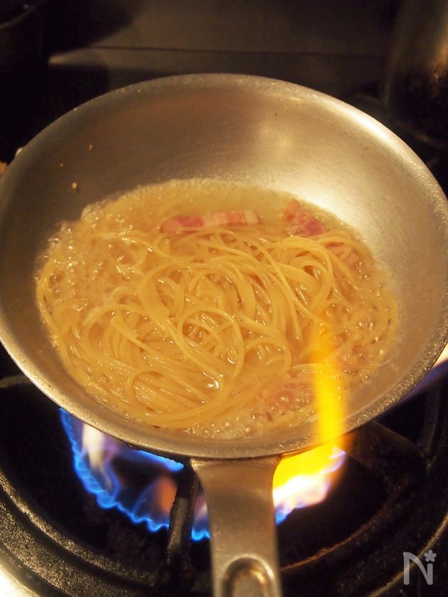 スパゲッティーニは早めに上げてフライパンの中で仕上げて下さい。強火にで熱することで細かい粒子が砕け水分と油が乳化しソースになります!