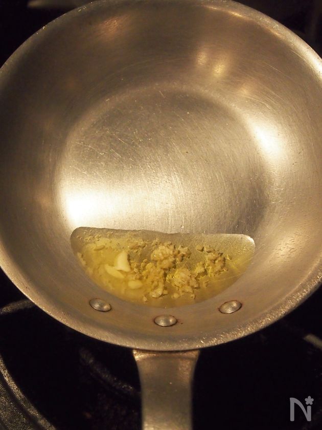 フライパンにサラダ油orオリーブオイル、バター、にんにくを入れ熱する。