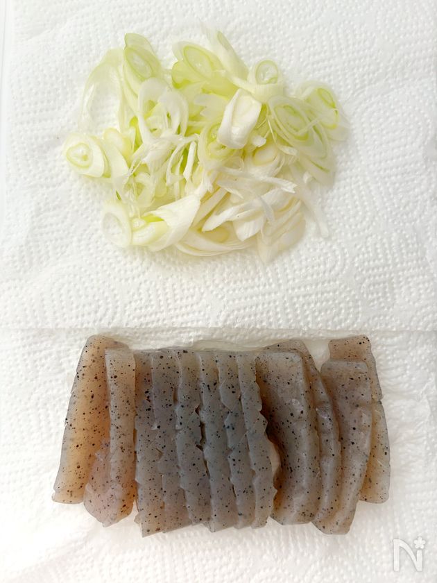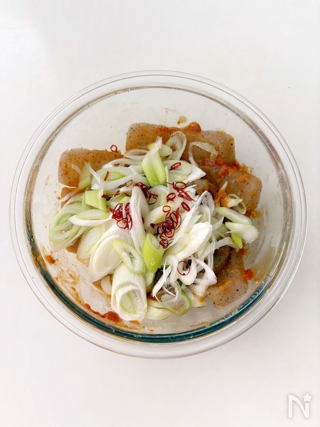 (3) 【A】を加え、こんにゃくによく練り込んだら、長ネギ、輪切り唐辛子を入れ、ラップをかけずに、電子レンジ500Wで、2分加熱し、そのまま5分ほどおく。