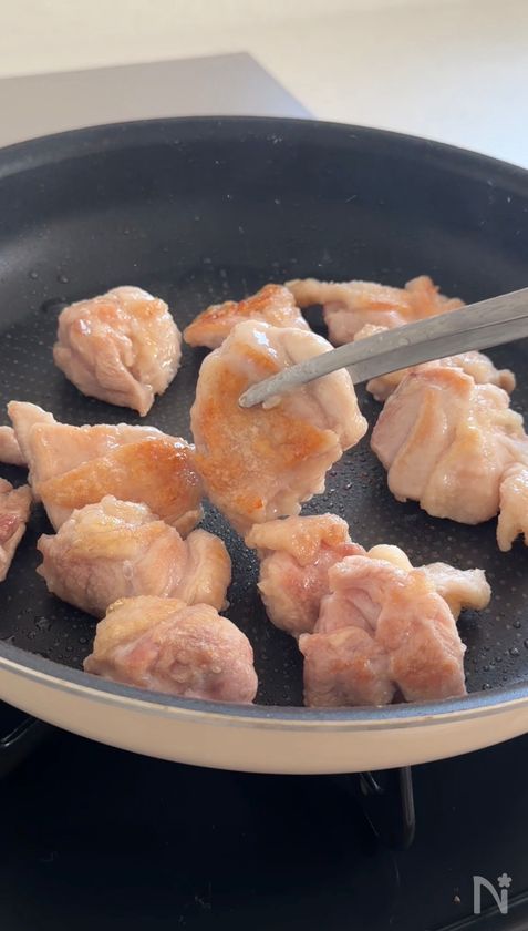 (2) フライパンに油を中火で熱し、鶏もも肉を両面に焼き色がつくまでしっかり焼く。