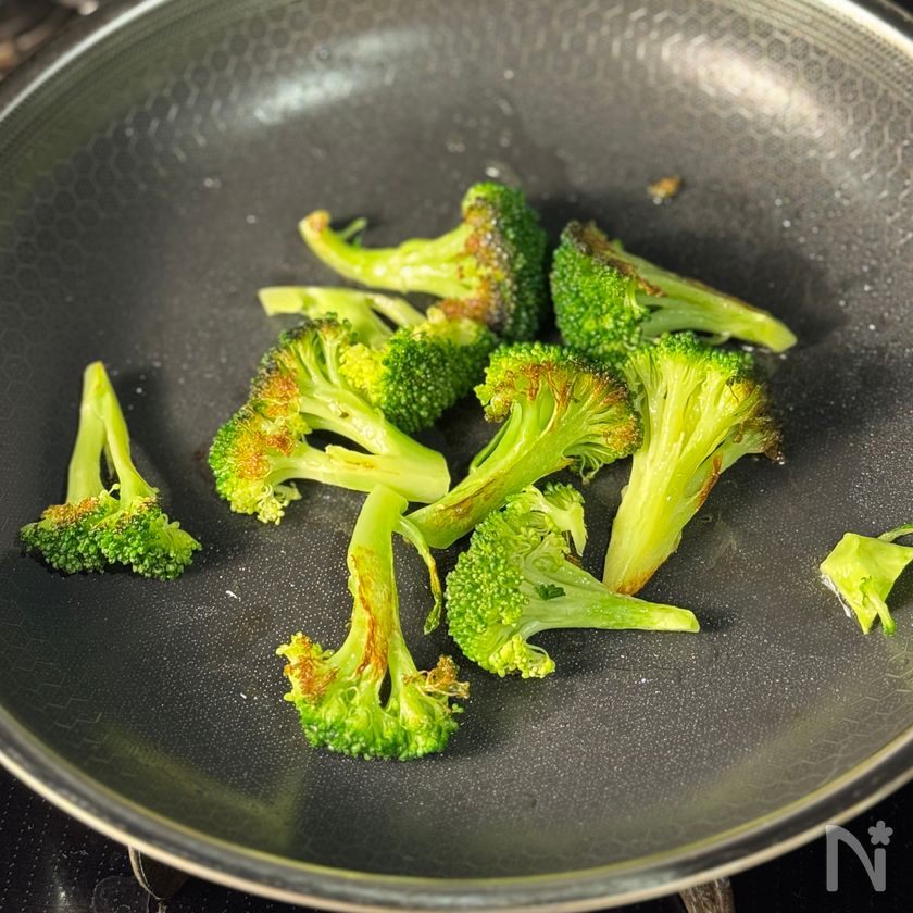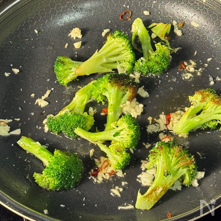 (2) 残りのオリーブオイル(大さじ1)・にんにく・輪切り唐辛子を加え、中火にして炒め合わせる。にんにくの香りが立ち、ブロッコリーにほんのり焼き色がついたら、塩で味をととのえる。