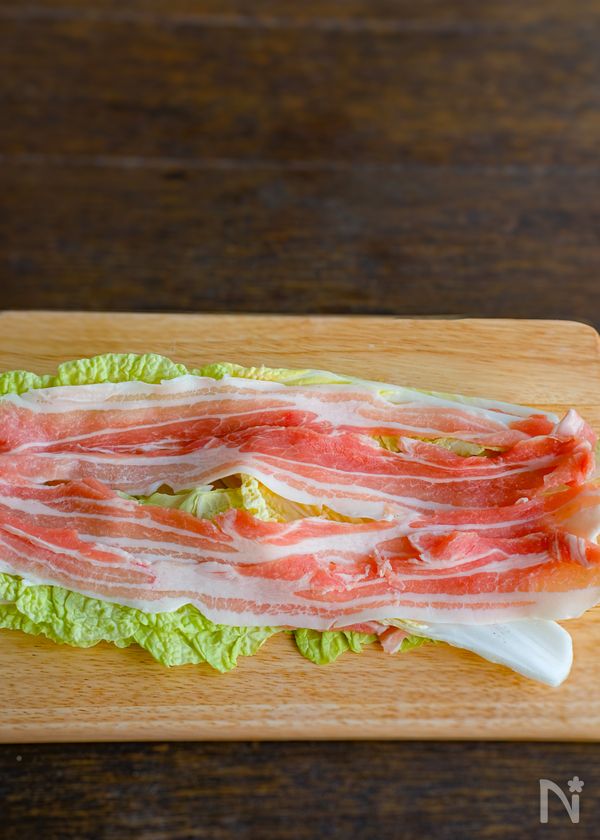 (2) 白菜は1枚づつ剥がし、白菜と豚バラ薄切り肉を交互に重ねていく。