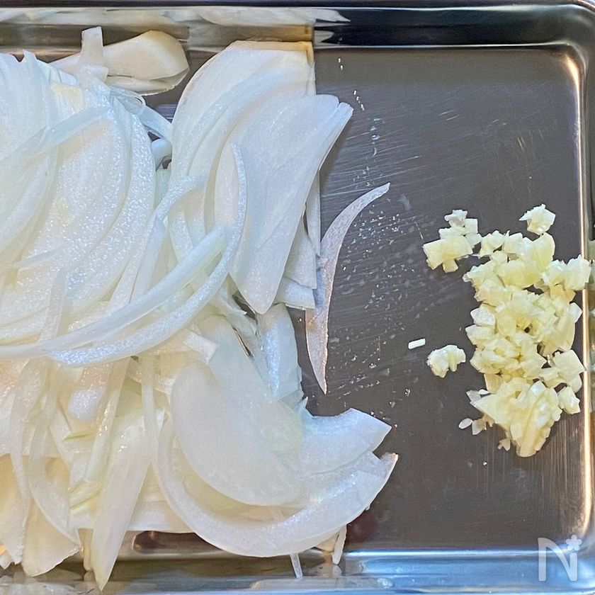 (2) 玉ねぎは繊維に沿って薄切りにする。