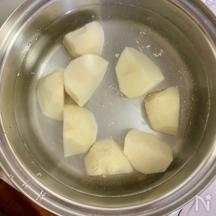 かぶるくらいの水を注いで火にかけ、沸騰したらじゃがいもに金串がスッと通るまで弱火で10〜15分ほどゆで、ざるに上げて水気をきる。
