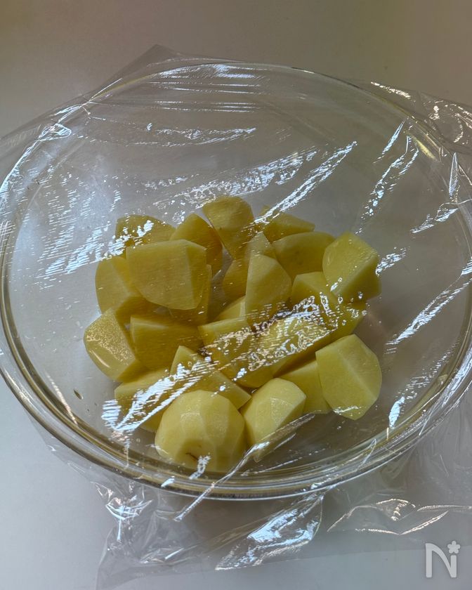 (1) じゃがいもは皮をむいて一口大に切り、耐熱ボウルに入れる。ふんわりとラップをして、電子レンジ(600W)で約5分、竹串がすっと通るまで加熱する。