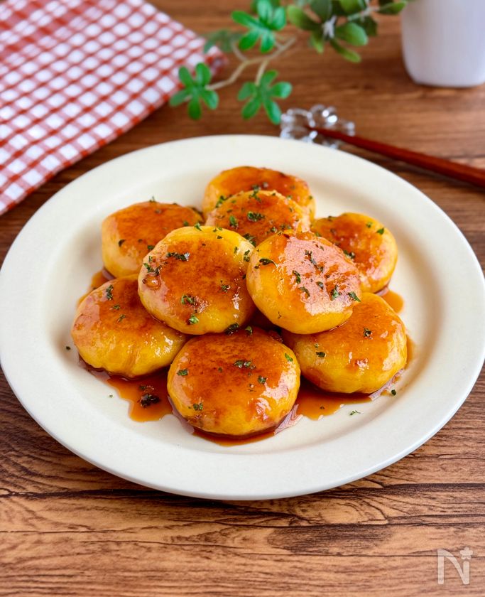 (6) 全体に照りが出るまでやさしくからめて火を止め、器に盛る。お好みで刻みパセリをふる。