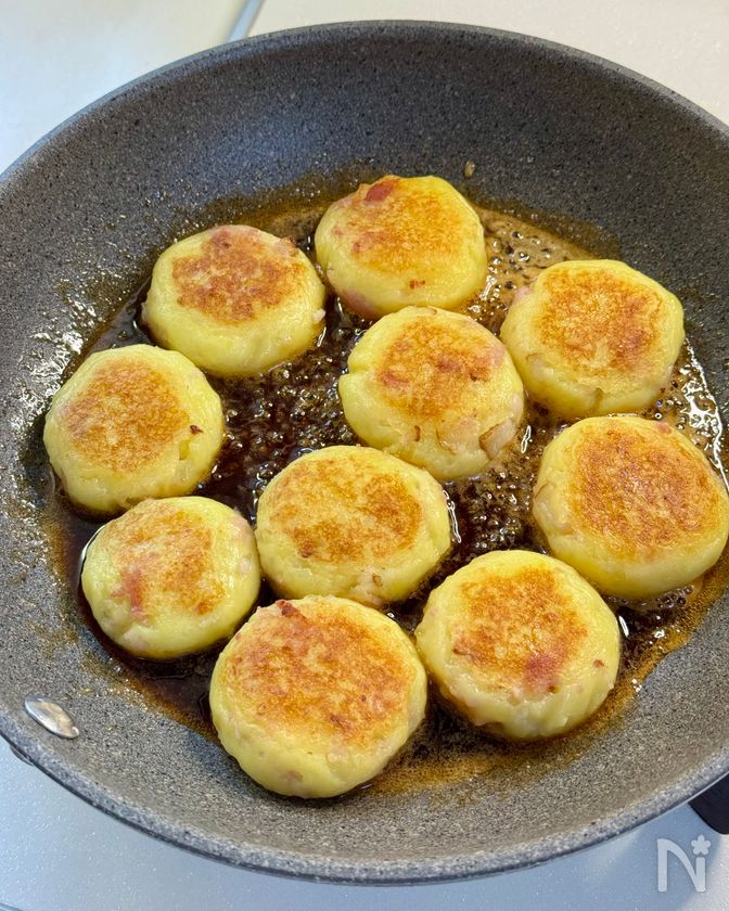 (5) キッチンペーパーで軽く油を拭き取り、【A】を入れて弱火にかける。煮立ったらバター(有塩)を加えて溶かし、4の焼いたじゃがいも餅を戻し入れる。