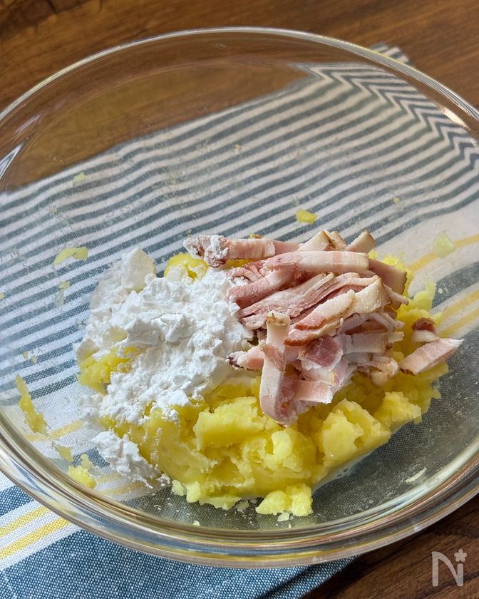 (2) じゃがいもがやわらかくなったらマッシャーでつぶす。ハーフベーコンは細切りにし、ボウルに加える。さらに片栗粉、牛乳を加えてよく混ぜ合わせる。