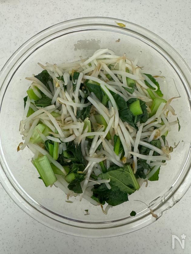 (1) 耐熱容器に、もやしと小松菜を入れ、ラップをして、電子レンジ(600w)で、2分加熱したら取り出し、軽く混ぜ、更に2分加熱する。