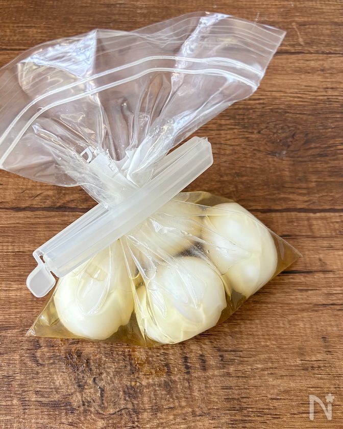 (2) ポリ袋に卵、【A】を入れて空気を抜いて閉じたら、冷蔵庫で4時間以上漬ける。