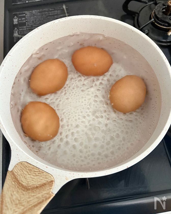 (1) 鍋にたっぷりの水を入れて沸騰させ、冷蔵庫から出したての卵をそっと入れる。