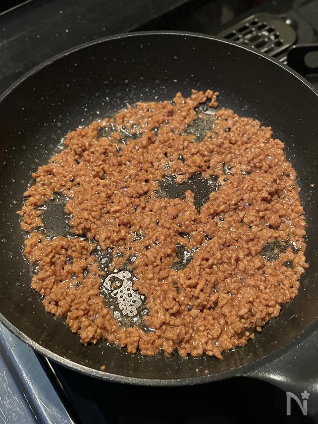 豚ひき肉を炒める際、ひき肉から脂が出てくるので油はひかなくてもOKです。(炒めている途中で脂が多く出た場合はキッチンペーパーで取り除いて下さい。)