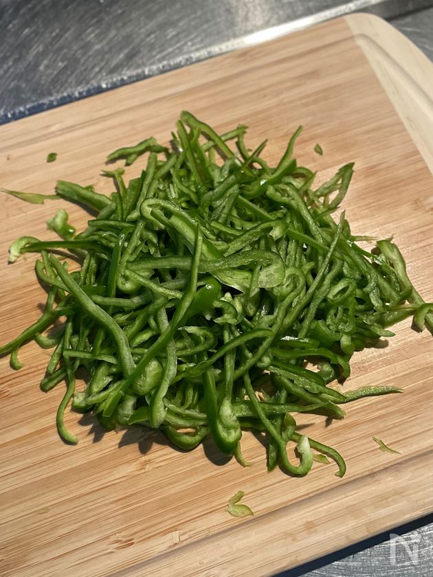 (1) ピーマンは細切りにし、器に盛っておく。