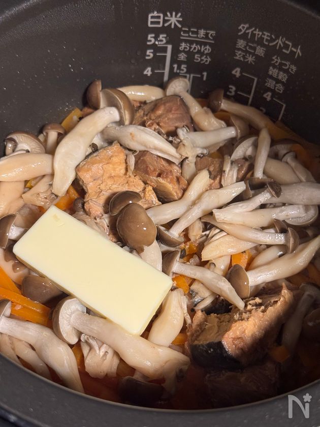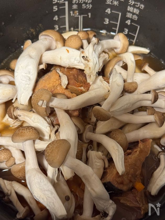 (3) 人参、鯖味噌煮缶(汁ごと)、お好きなキノコ(しめじや舞茸など)をほぐして入れて普通炊飯する。
