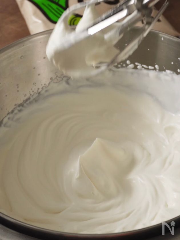 (5) 【B】をボウルに入れ、氷水(分量外)にあてながら、ツノが立つ程度の8分立てにする。