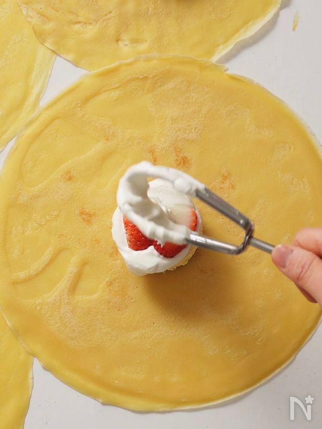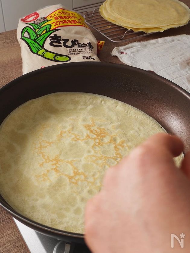 ・クレープ生地を焼く時のフライパンは30cmほどの大きさのものを使ってください。小さすぎると中のものが包み込めなくなってしまいます。